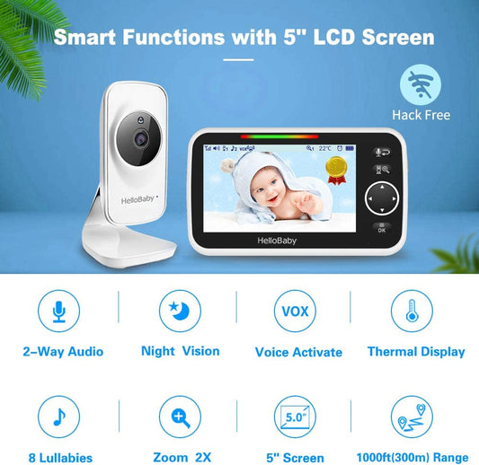Monitor, Video Baby Monitor with Camera and Audio, 5” Large Display No Hacking Risks, Bright Night Vision, 2-Way Talk, Temperature, 8 Lullabies and 1000Ft Long Range